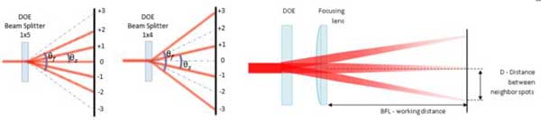 一维或二维阵列光束,通过透镜聚焦后可形成焦点阵列,用于高功率激光并行加工。