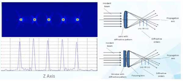 与前述几类衍射元件主要在特定工作面或一定景深范围内,产生横向(垂直于激光传输方向)平面的光强分布不同,焦点衍射元件用于激光聚焦后纵向(沿激光传输方向)的特定分布。