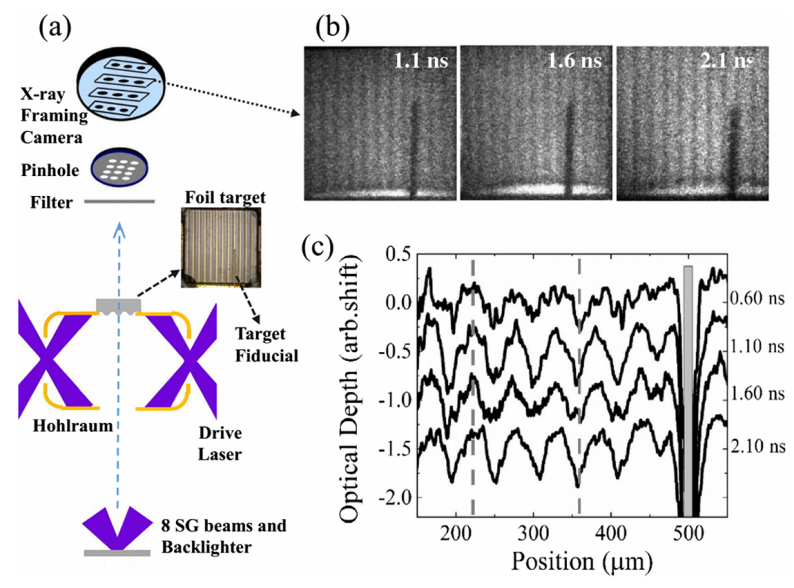 图1 (a)实验设置示意图,(b)x射线分帧相机得到的图像,(c)从x射线分帧相机图像测得的光学深度