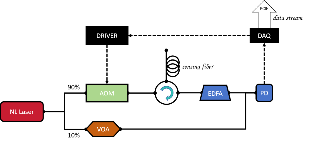 我们搭建的DAS系统结构图如下所示。窄线宽激光器(NL Laser)输出的激光分为两路,10%的成分通过可调光衰减器(VOA)进行光功率控制,90%的光使用AOM进行脉冲化调制后,进入光环形器1端口,2端口连接分布式传感光纤,3端口接受传感光纤后向散射回的光,然后通过小信号EDFA对微弱的返回光进行放大,最后和VOA控制的本振光合束拍频,使用PD转化为电压信号交给采集卡去解调。